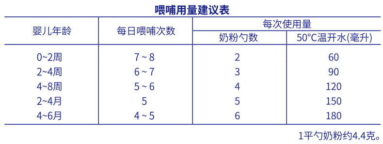 平勺奶粉 依照喂哺用量建議表,加入正確份量(平勺)的奶粉,請(qǐng)勿刻意壓平量勺。